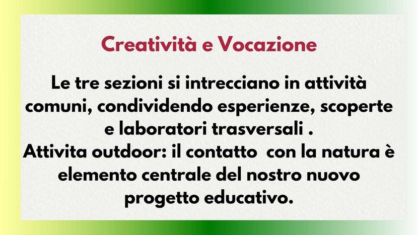 Le sezioni si intrecciano in esperienze comuni e laboratori trasversali. Centrale rimane l’outdoor education, per un contatto diretto e quotidiano con la natura.